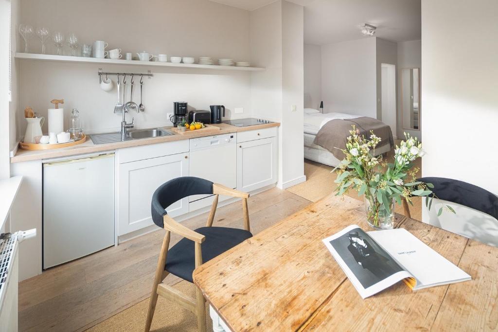 Komfortable Unterkunft: Die Unterkunft Friedrich Inn in Norderney bietet ein modernes Apartment mit einer voll ausgestatteten Küche, einem eigenen Badezimmer und kostenlosem WLAN. Sie genießen Annehmlichkeiten wie Bademäntel, eine Terrasse und einen Sitzbereich.