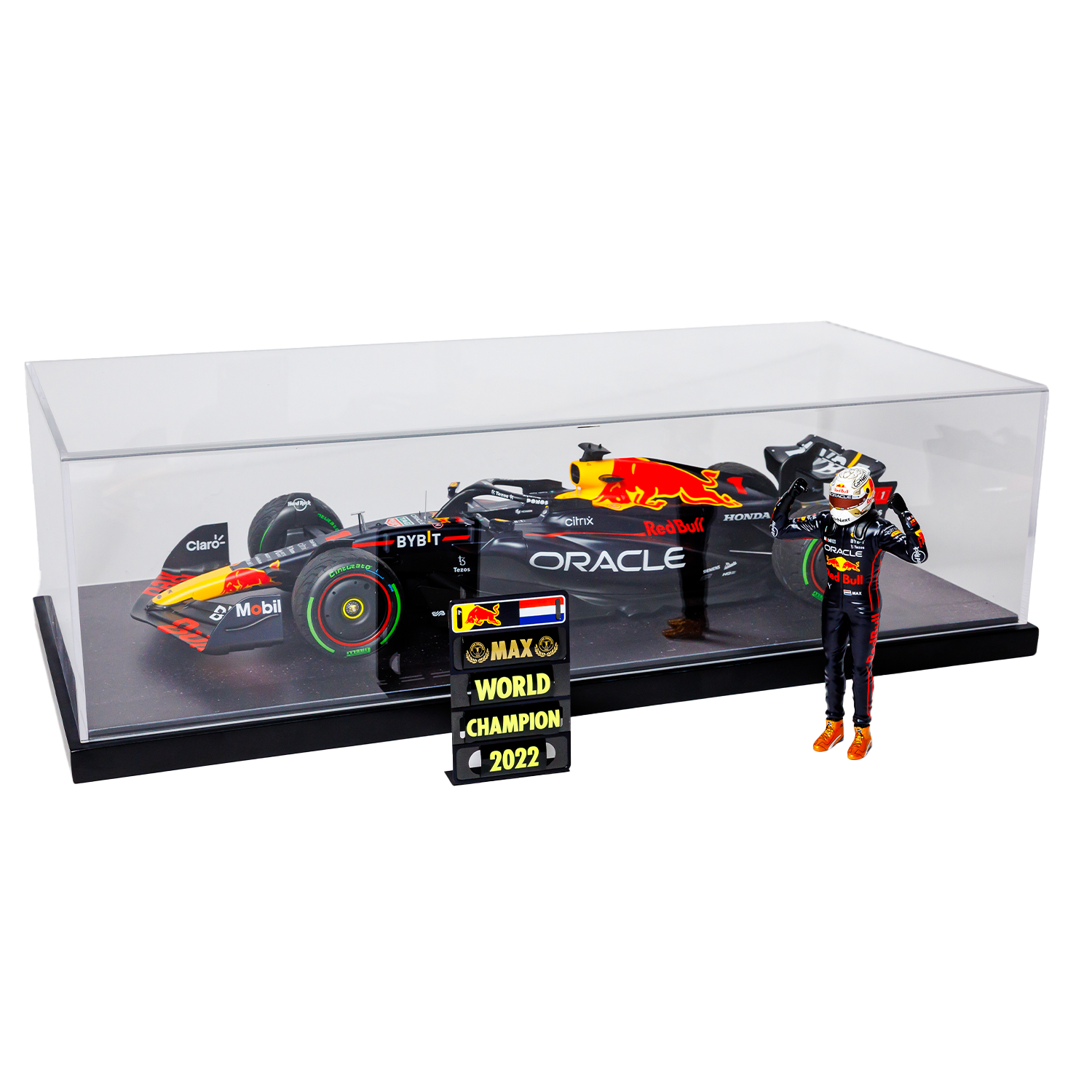1:12 RB18 - Japan 2022 - Wereldkampioen De race in 2022 op het natte Suzuka kende een chaotische start en een bizarre ontknoping. Na wat verwarring over de puntentelling, nadat Max Verstappen met een overtuigende voorsprong als eerste over de finish kwam, was duidelijk dat Max niet alleen de winst in Japan, maar ook zijn tweede wereldtitel had binnengehaald. Max liet na de race weten: “Ongelooflijk, dit had ik nooit durven dromen. Het is te gek om terug te kijken op het geweldige jaar dat we hebben gehad. Vorig jaar hebben we tot het einde moeten strijden en dit jaar hadden we echt een geweldige auto. Ik ben dankbaar voor iedereen die heeft bijgedragen aan dit succes. Om nu twee jaar op rij kampioen te worden is prachtig. Vooral hier, dat maakt mij erg trots." Belangrijkste kenmerken van dit schaalmodel * 2e Formule 1-wereldtitel * Inclusief miniatuur van Max * Inclusief pitbord 'Max Wereldkampioen 2022' * Finish versie van de RB18 op de intermediate band * Honda, BINGO en