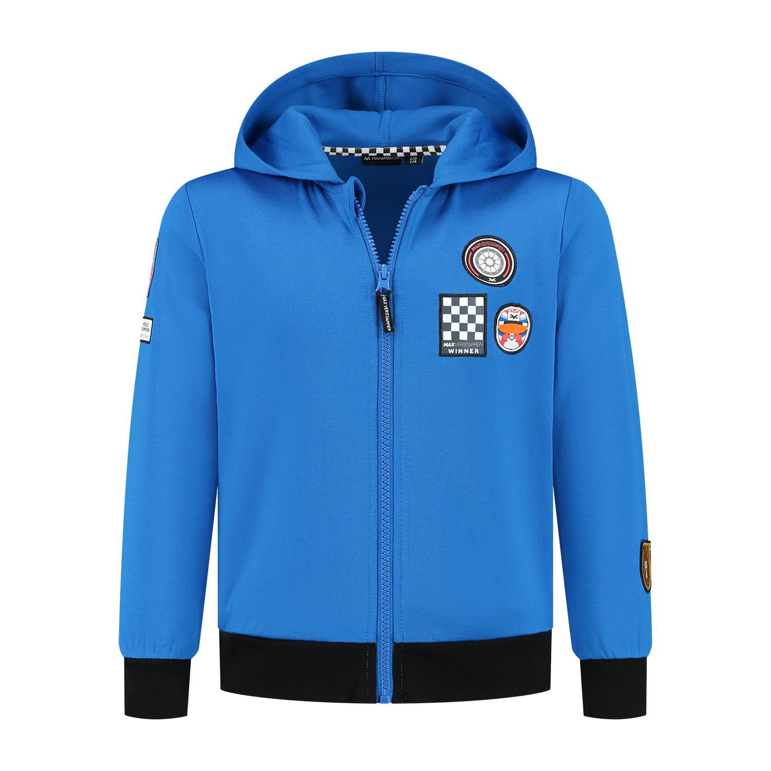 MV Kids - Zip-Hoodie - Kobalt  Het MV Kids vest is perfect voor jonge Max Verstappen fans die hun steun voor de kampioen willen tonen! Met stoere badges die zijn meervoudige kampioenschappen vieren, biedt dit vest een stijlvol en sportief ontwerp. Gemaakt van hoogwaardige materialen, is het ideaal voor dagelijks gebruik en houdt het kinderen warm tijdens elke gelegenheid. Dit vest is een must-have voor elke jonge Max Verstappen fan die de passie voor racen met trots wil dragen! Eigenschappen: * Materiaal: 95% Neopreen polyester, 5% Spandex * Rib boorden: 95% Katoen, 5% Elastaan * Gewoven patches op de borst en mouwen * Padded branded zipperpuller * Plastic rits * Capuchon * MV woven zijlabel * Gewoven nektape in finishvlag stijl * Contrasterende ribboord Onderhoudsinstructies: * De opdruk niet strijken * Wasmiddel voor de gekleurde was gebruiken * Binnenstebuiten wassen en strijken * Was met gelijke kleuren