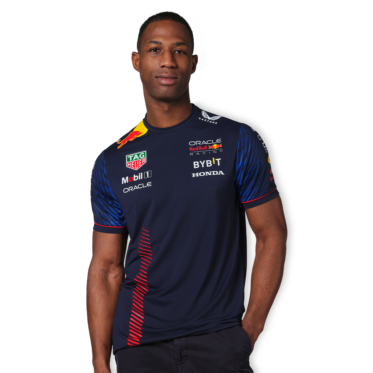 Red Bull Racing fans, deze is voor jullie. De klassieke pasvorm van de Team T-shirt 2023 is gecombineerd met authentieke branding en elementen van het Red Bull Racing logo. Het T-shirt is voorzien van dryCELL vochtafvoerende technologie voor comfortabel dragen de hele dag door. De Red Bull Racing Teamline T-shirt voor heren 2023 is een exacte replica van het Red Bull Racing team tenue welk wordt gedragen tijdens het formule 1 seizoen van 2023 door zowel het team als Max Verstappen zelf. De Red Bull Racing Team T-shirt is een echte must-have voor de diehard Formule 1 en Red Bull Racing fans en is perfect om te dragen tijdens de warmere racedagen! Eigenschappen Red Bull Racing Team T-shirt Heren 2023: * Oracle Red Bull Racing Teamline 2023 * 83% Polyester en 17% Elastaan * Team/partner logo's op voorkant, achterkant en mouw * Red Bull Racing logo op achterkant * DryCELL technologie * Crafted by Castore Onderhoudsinstructies: * De opdruk niet strijken * Wasmiddel voor de