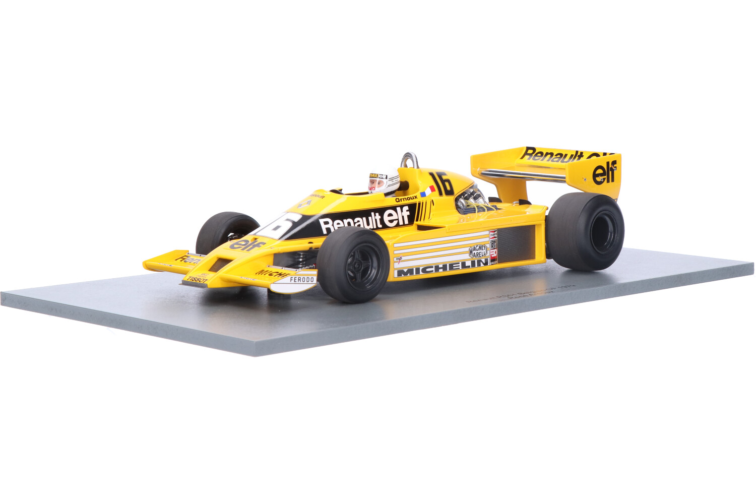 Dit product van het merk Renault F1 en het type RS01 met artikelnummer 18S502 is uitgevoerd in de schaal 1:18, wat inhoudt dat het ± 23 cm groot is. De fabrikant is Spark en het gebruikte materiaal is Resin. De bestuurder is René Arnoux voor het team Equipe Renault Elf. Het startnummer is 16. Dit product deed mee in het 1979 seizoen in de Belgian GP race.